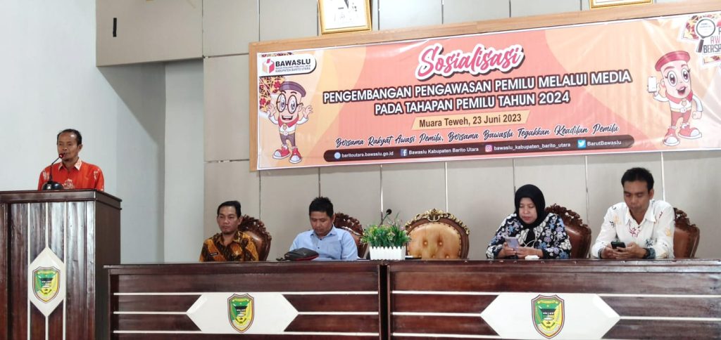 Barito Utara, Kalteng – Guna meningkatkan peran media dalam pengawasan Pemilu, Badan Pengawas Pemilu (Bawaslu) Kabupaten Barito Utara (Barut) menggelar sosialisasi pengembangan pengawasan Pemilu melalui media pada tahapan Pemilu tahun 2024, di Aula Kantor Kecamatan Teweh Tengah, Jumat (23/6/2023).