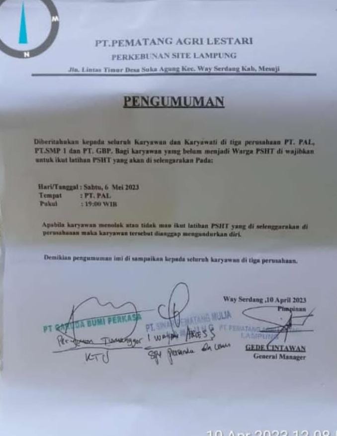 “Perusahan ini kok aneh ya, ada surat edaran bahwa untuk semua karyawan Laki-laki maupun Perempuan yang belum menjadi Warga PSHT di wajibkan mengikutinya yang akan di selenggarakan di PT. PAL tanggal 06 Mei 2023. Pukul. 19.00 Wib.