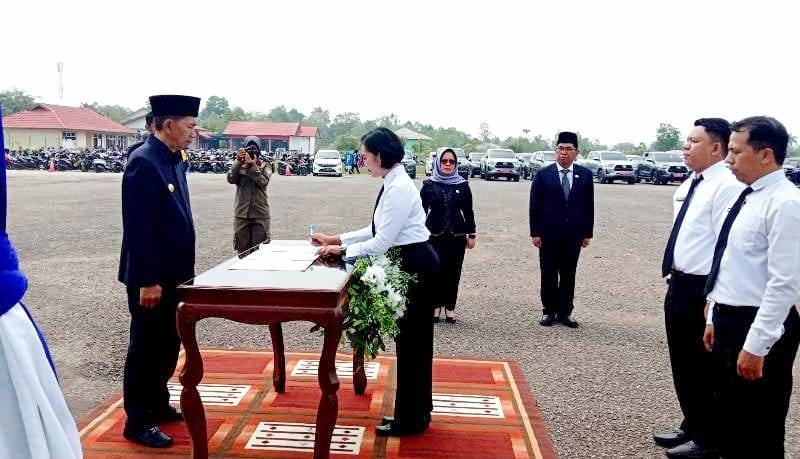 Barito Utara, Kalteng – Diakhir masa jabatannya, Bupati Barito Utara (Barut) H Nadalsyah menyerahkan Surat Keputusan (SK) kepada 65 Pegawai Pemerintah dengan Perjanjian Kerja (PPPK) sekaligus pengambilan sumpah dan janji jabatan fungsional lingkup Pemkab Barito Utara, Sabtu (23/9/2023) di eks Bandara Beringin Muara Teweh.