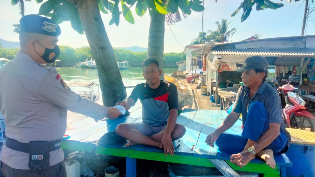 Kegiatan pembagian masker kali ini dilakukan di Pelabuhan Paku Anyer. Adapun personel yang melaksanakannya ialah Bripka Riko dan Brigpol Hendry pada Minggu (20/3/2022).