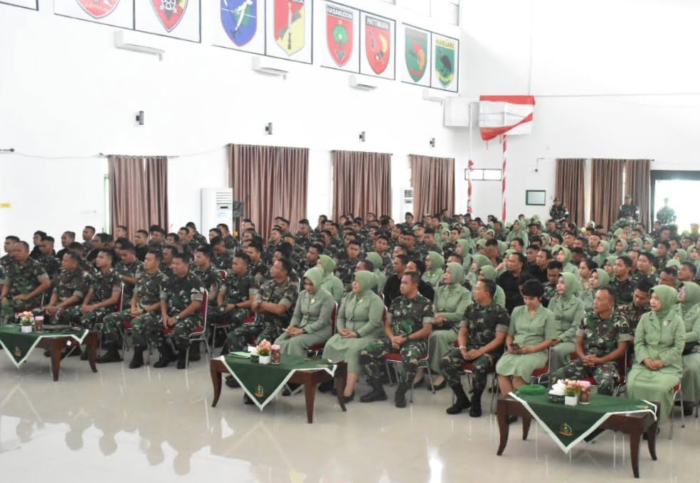 GORONTALO – Komandan Korem (Danrem) 133/Nani Wartabone Brigjen TNI Totok Sulistyono, S.H., M.M., M.I.P., didampingi Ketua Persit Kartika Chandra Kirana Koorcab Rem 133 PD XIII Merdeka Ny. Dewi Totok Sulistyono, memberikan Jam Komandan tentang Sosialisasi Netralitas TNI kepada Prajurit, Persit dan PNS satuan jajaran Korem 133/Nani Wartabone.