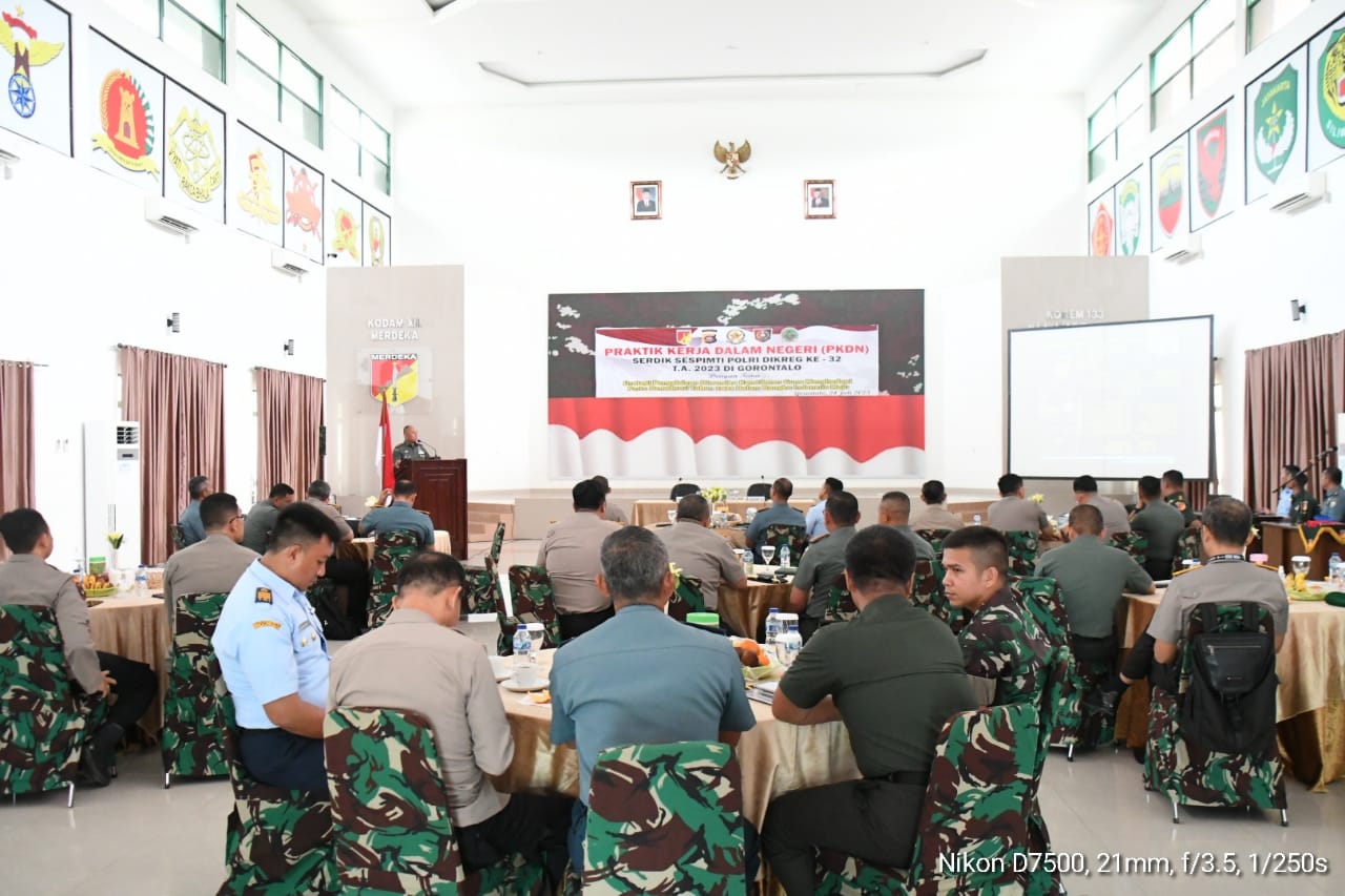 GORONTALO – Komandan Korem 133/Nani Wartabone Brigjen TNI Totok Sulistyono, S.H., M.M., M.I.P., menyambut kunjungan Tim Praktik Kerja Dalam Negeri (PKDN) peserta didik Sespimti Polri Dikreg ke-32 Tahun 2023, bertempat di Aula Kusno Danupoyo Korem 133/NW, Jl. Trans Sulawesi Ds. Tridarhma Kec. Pulubala Kab. Gorontalo, Senin (24/7/23).