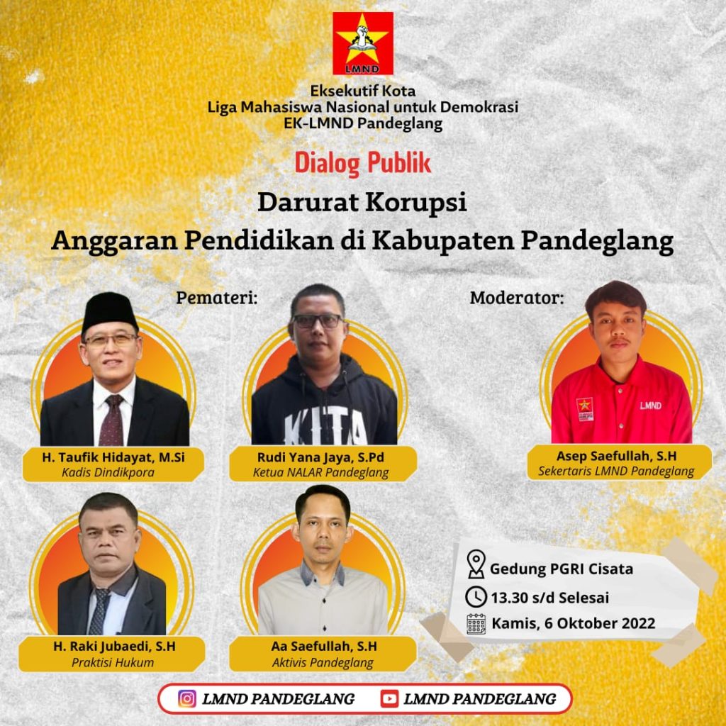 “Dialog publik dengan tema Darut korupsi Anggaran Pendidikan di Kabupaten Pandeglang yang akan digelar merupakan sikap kritis LMND atas situasi pendidikan di kabupaten Pandeglang,” kata Abdullah. Rabu (5/10/2022).