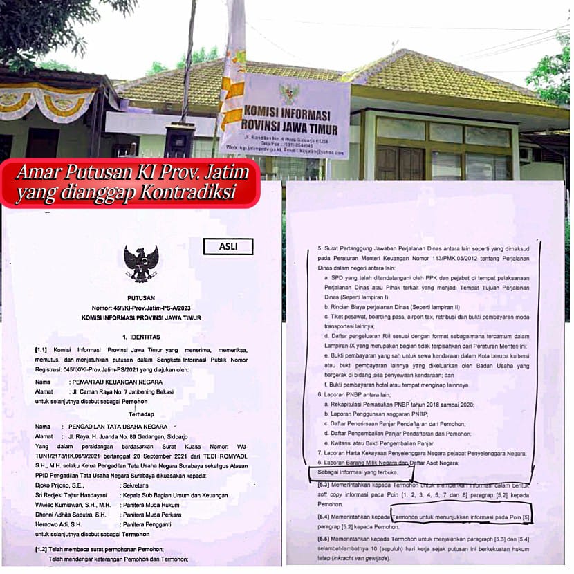 JAWA TIMUR – Jika sebelumnya sengketa UU No.14 Tahun 2008 antara Pemantau Keuangan Negara (PKN) melawan Ketua Pengadilan Tata Usaha Negara (PTUN) Surabaya, telah diselesaikan oleh Komisi Informasi (KI) Provinsi Jawa Timur melalui amar putusan Nomor: 45/l/KI-Prov.Jatim-PS-A/2023.
