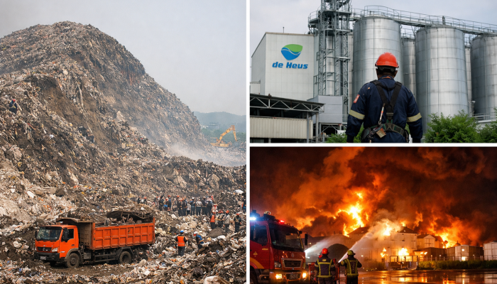 Kolase peristiwa longsor TPST Bantargebang, insiden industri PT De Heus, dan kebakaran SPBE Cimuning yang terjadi dalam waktu berdekatan di Bekasi.