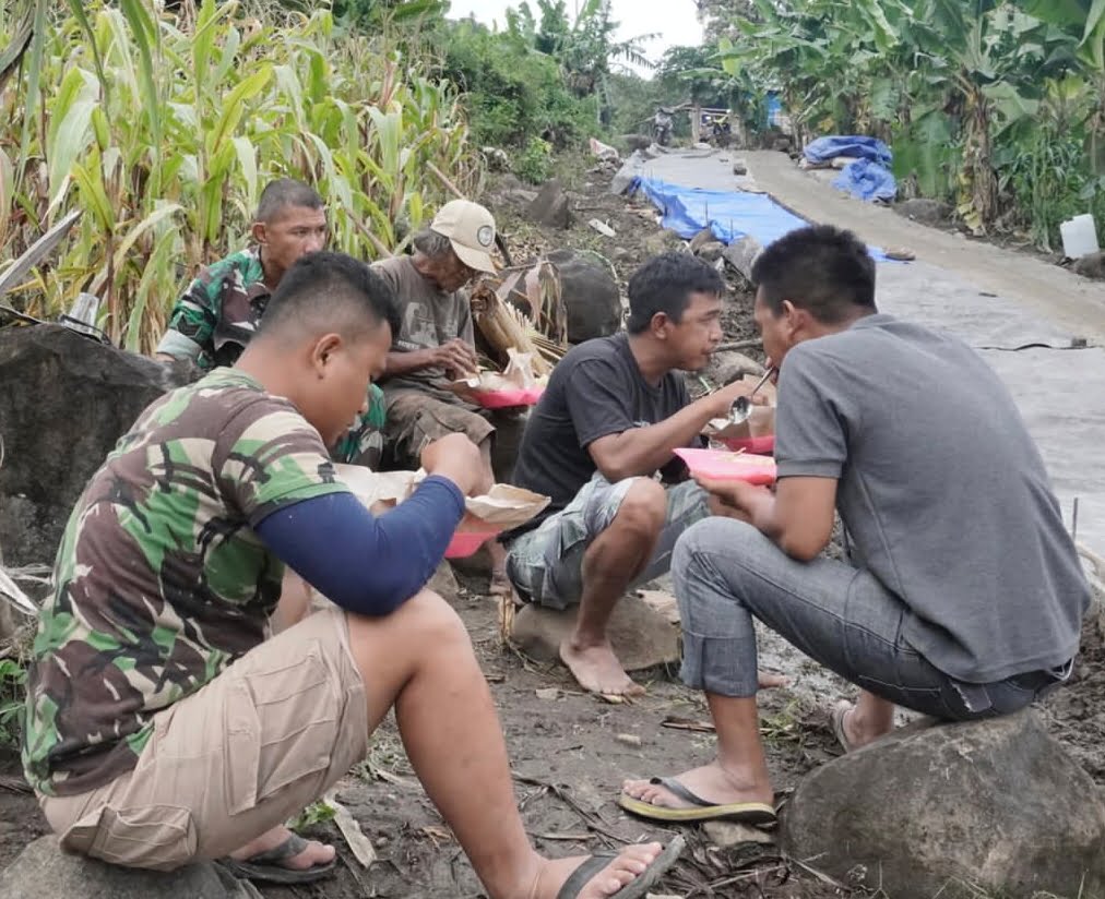 Pelda Saleh Sulaiman yang setiap hari melaporkan kegiatan TMMD saat itu juga tergabung dalam suasana istirahat siang sambil menikmati makan siang, nampak kecerian dan hangatnya jalinan persaudaraan antara warga dengan satgas TMMD.