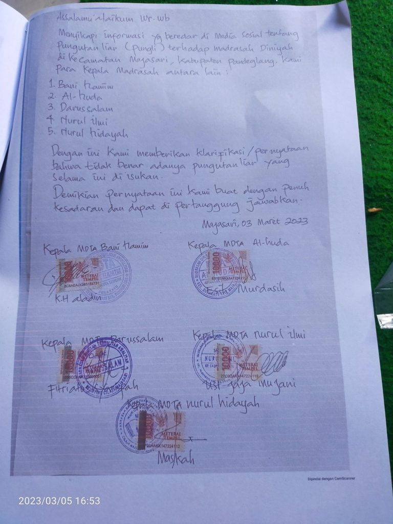 “Selain itu para kepala MDTA itu telah mengklarifikasi tudingan adanya pungli itu, bahwa bantuan yang diberikan itu adalah infaq dan shodaqoh dari lima MDTA di Kecamatan Majasari,” pungkasnya.