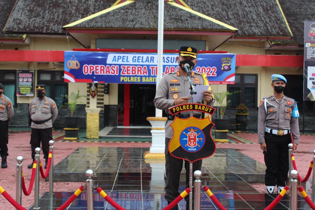 Barito Utara – Apel Gelar Pasukan dalam rangka kesiapan pelaksanaan Operasi Zebra Telabang 2022 dipimpin langsung Kapolres Barito Utara AKBP Gede Pasek Muliadyana, di halaman Mapolres setempat, Senin (3/10/2022).