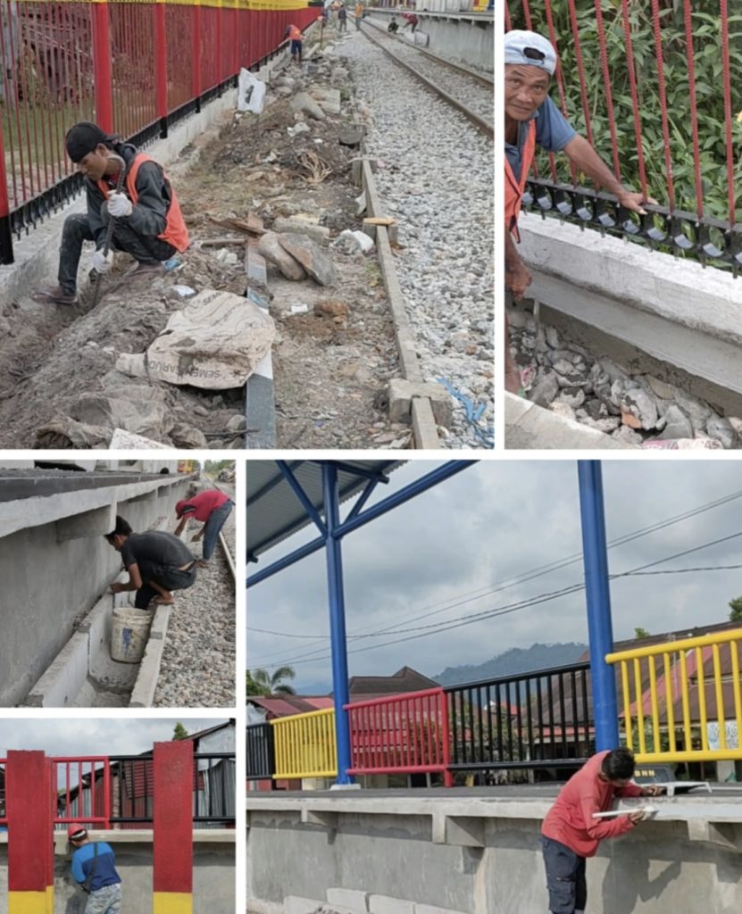 Dilokasi pekerjaan, terlihat sejumlah pekerja yang berkisar 6 orang sedang menambal beton peron penumpang dan sebagian lagi terlihat sedang mengecat dinding beton peron.