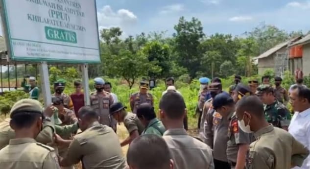 Mesuji – Petugas gabungan dari jajaran Polres Mesuji, Polda Lampung bersama TNI, Satpol PP dan Polsek jajaran melakukan pembongkaran plang dan banner yang bertuliskan khilafatul muslimin di wilayah hukum Polres Mesuji. Senin (13/6/2022).
