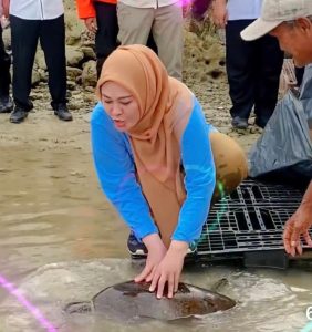 Bupati Pandeglang Irna Narulita melepas induk penyu di pantai sekitar Tanjung Lesung, Rabu 7 Juni