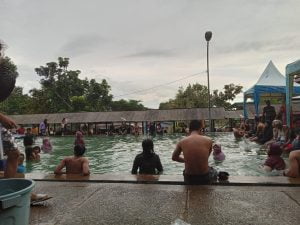 Wisatawan memadati kawasan obyek wisata pemandian air panas cisolong pada libur akhir pekan, Minggu (7/5/2023).