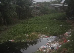 Bekasi – Hamparan tumbuhan liar eceng gondok memenuhi aliran kali tepatnya di Desa Kedung Jaya,