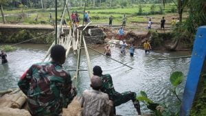 Pandeglang – Anggota Koramil 0112/Jiput Kodim 0601/Pandeglang, bersama warga gotong-royong membangun jembatan di Desa Sukacai,