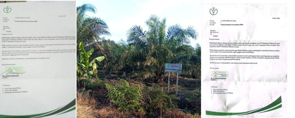 Hal tersebut dibuktikan dengan adanya surat bernomor 13/DIR-MMAL/V/2023, 16/DIR-MMAP/2023 tertanggal 9 Mei 2023, yang dilayangkan oleh PT MMAL kepada Wakiram dan Imam, pemilik lahan yang merupakan warga Desa Palih Baru, yang bersengketa lahan dengan pihak PT MMAL.