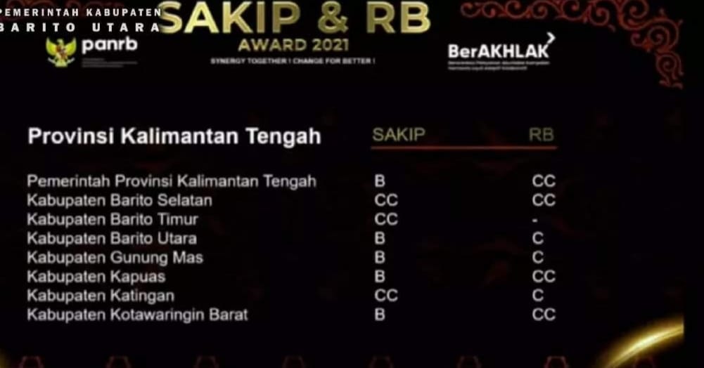Adapun nilai Kabupaten Barito Utara (Barut) untuk Sistem Akuntabilitas Kinerja Instansi Pemerintah (SAKIP) mendapat nilai B dan untuk penilaian Reformasi Birokrasi (RB) mendapat nilai C.