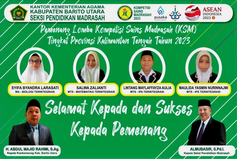 Ke empat siswa siswi madrasah tersebut tiga dari MTsN Barito Utara atas nama Maulida Yasmin Nurinnajmi Mapel 1 KMS bidang IPS Terpadu Terintegarsi, Lintang Maylaffayza Aulia, juara 1 KSM Mapel IPA Terpadu Terintegarsi dan Salwa Zalianti, juara 1 KSM Mapel Matematika Terpadu Terintegarsi. Dan siswi MAN atas nama Syifa Byandra Larasati, juara 1 KSM Mapel Biologi.