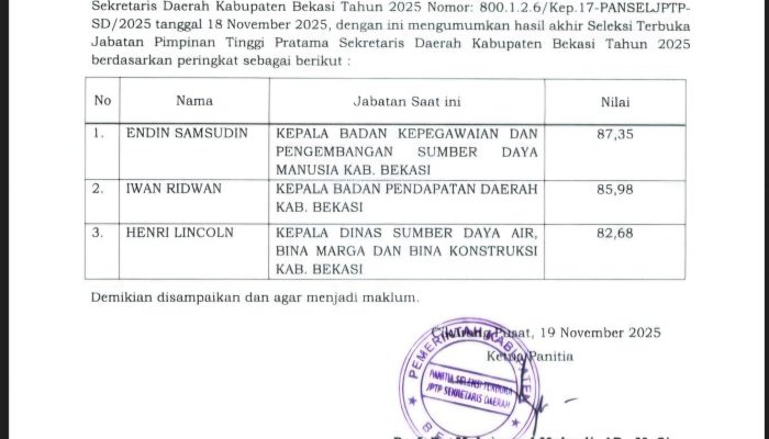 BEKASI – Proses seleksi terbuka Jabatan Pimpinan Tinggi Pratama (JPTP) Sekretaris Daerah Kabupaten Bekasi memasuki tahap final. Panitia Seleksi resmi mengumumkan tiga nama pejabat yang lolos sebagai kandidat teratas dalam seleksi Sekda Kabupaten Bekasi Tahun 2025. Pengumuman tersebut tertuang dalam surat Nomor 800.1.2.6/18-PANSEL/JPTP-SD/2025 yang dirilis pada 19 November 2025.