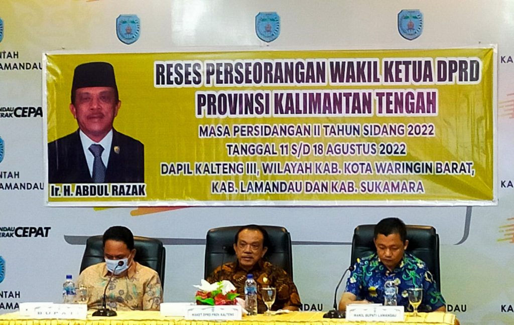 H Abdul Razak mengatakan, dalam reses ini kita menghimpun berbagai aspirasi yang disampaikan oleh masyarakat yang ada di Kab. Lamandau, adapun aspirasi yang disampaikan yakni mengenai harapan peningkatan sejumlah infrastruktur, sarana dan prasarana serta fasilitas publik.