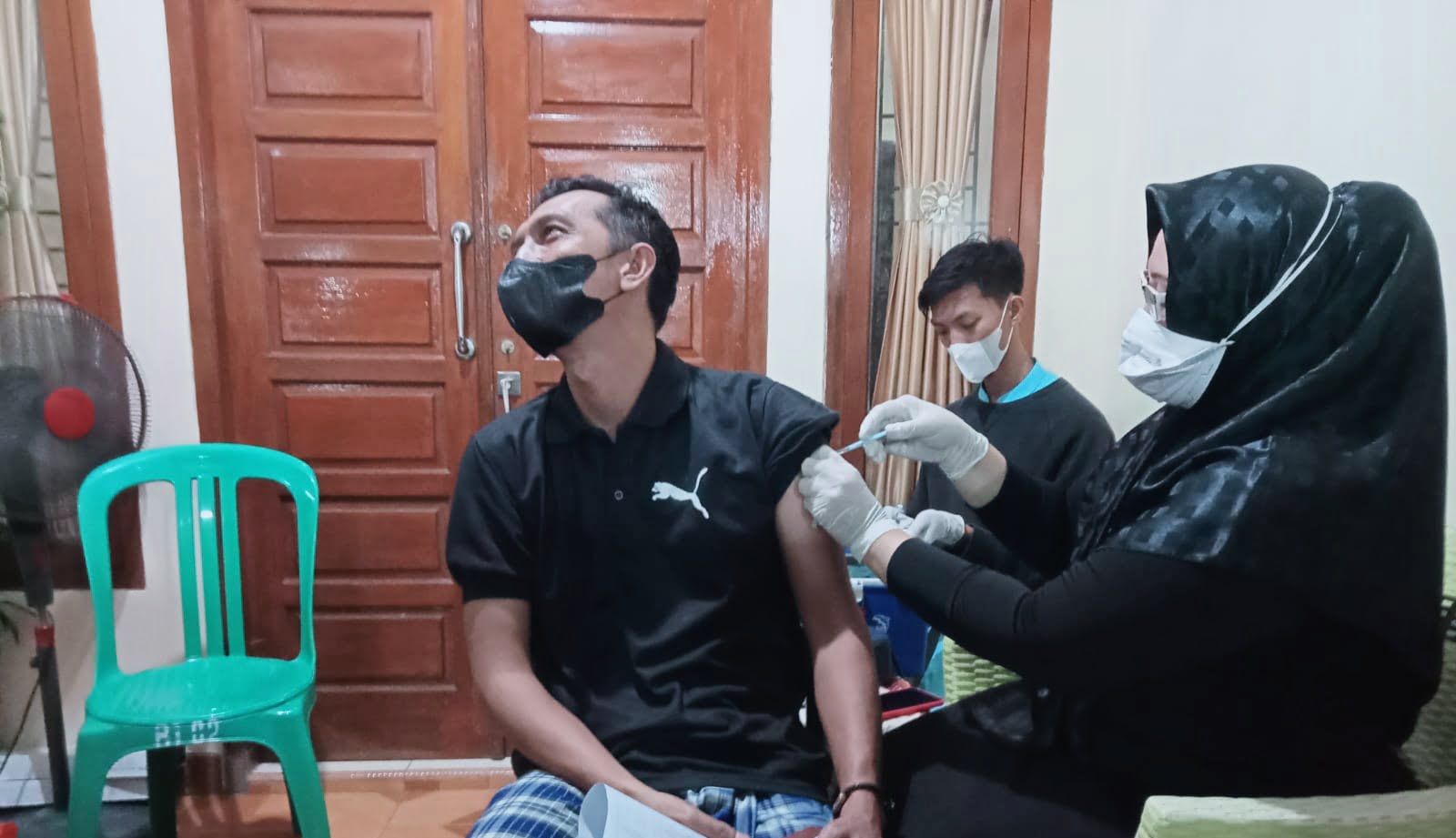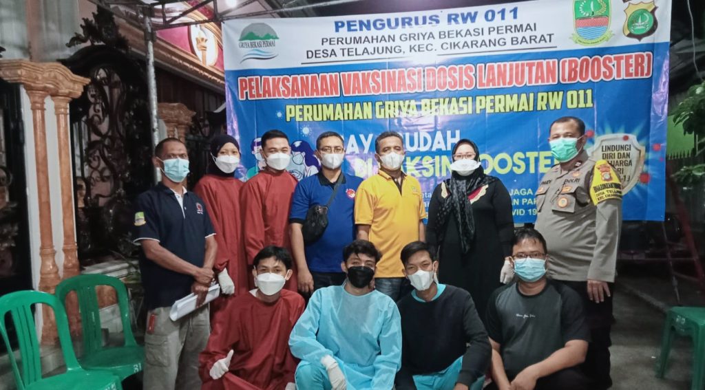 BEKASI – Warga perumahan Griya Bekasi Permai (GBP) 1 dari RT 001 s/d 010 RW 011 Desa Telajung Kecamatan Cikarang Barat Kabupaten Bekasi usai melaksakan sholat terawih mengikuti vaksinasi lanjutan (boster) jenis Astrazaneka.